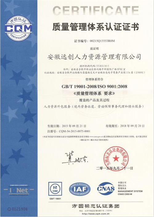 2015年9月,遠(yuǎn)創(chuàng)人力集團通過近一年的努力,積極配合方圓標(biāo)志認(rèn)證集團開展ISO9000質(zhì)量管理體系認(rèn)證審核工作,公司管理體系完全符合質(zhì)量管理體系要求,并成為省內(nèi)人力資源行業(yè)率先通過ISO9000質(zhì)量管理體系認(rèn)證的企業(yè)之一。