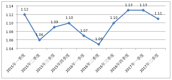 圖1:2015年第一季度-2017年第二季度崗位空缺與求職人數(shù)比率變化趨勢