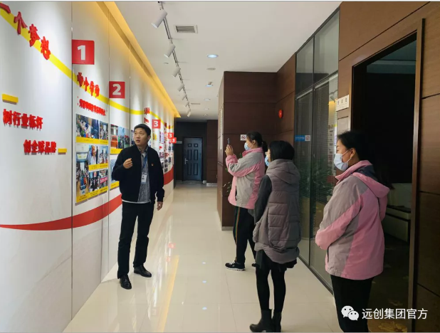 在解說員的引導(dǎo)下,朱俊玲園長一行實地參觀了集團發(fā)展歷程板塊、“六人”(12333)黨群文化體系、故事墻、群團活動室以及職工天地等,兩位支部書記詳細交流了關(guān)于黨群文化體系建立的過程。