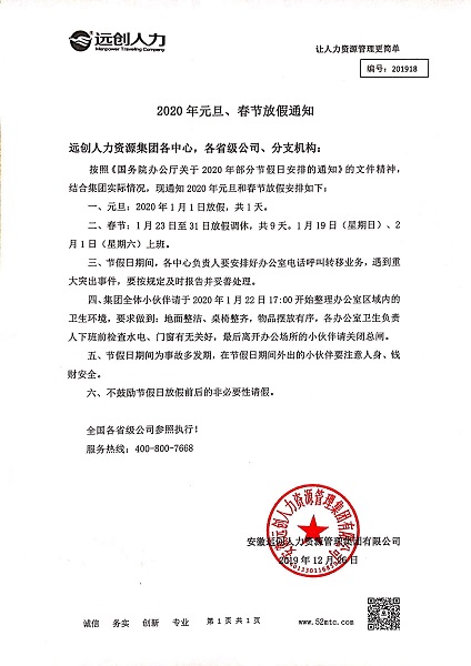 2019年遠創(chuàng)人力資源集團湖南省級公司國慶節(jié)放假通知|