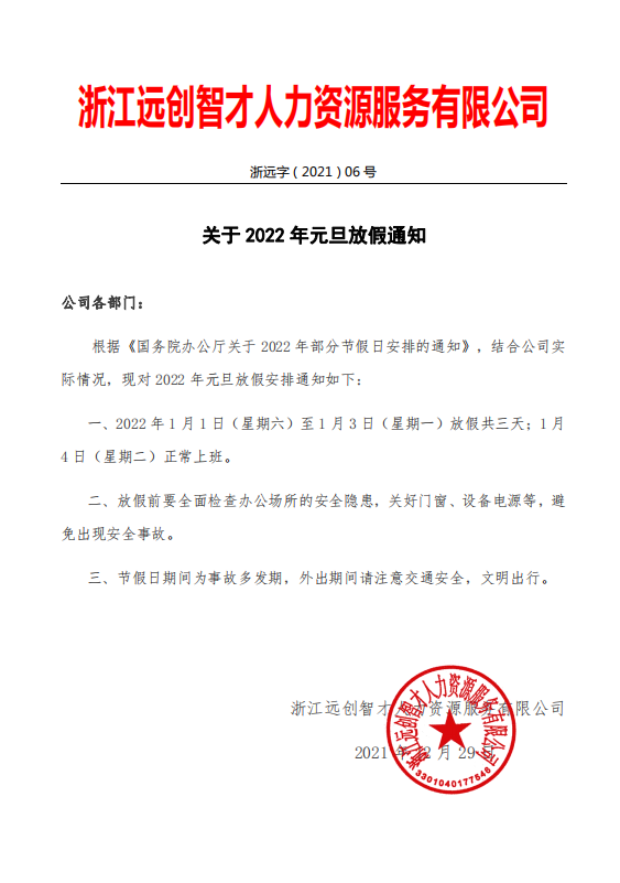 關(guān)于遠(yuǎn)創(chuàng)人力資源集團(tuán)浙江省級(jí)公司2022年元旦放假通知