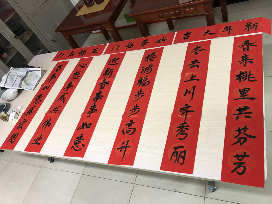天氣雖然寒冷,但活動室里洋溢出臘月天特有的喜慶。只見桌上鋪開了喜氣的大紅紙,一位聾啞人揮毫潑墨,大筆揮毫出飄散著清新墨香的一副副寓意吉祥的春聯(lián),送上了新春的美好祝福。