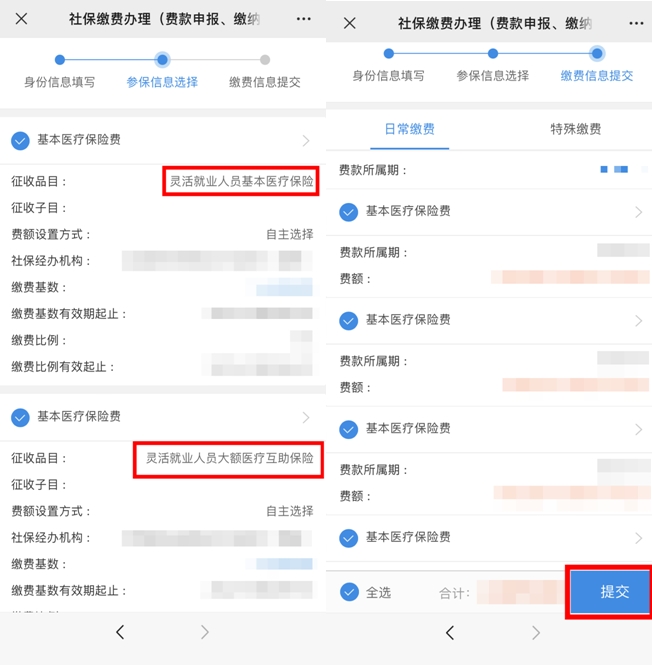 第三步:勾選【靈活就業(yè)人員基本醫(yī)療保險】和【靈活就業(yè)人員大額醫(yī)療互助保險】后,點擊【下一步】,確認(rèn)繳費金額,點擊【提交】,進(jìn)行繳費即可。