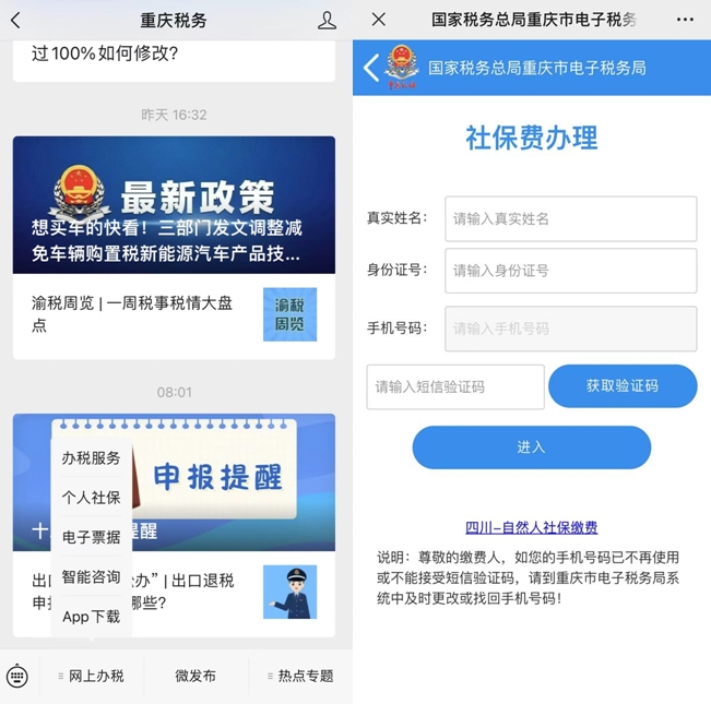 第一步,打開“重慶稅務(wù)”微信公眾號,點擊頁面底部【網(wǎng)上辦稅】-【個人社保】,依次輸入姓名、身份證號、手機(jī)號碼、驗證碼等信息后,進(jìn)入“社保費辦理”頁面。