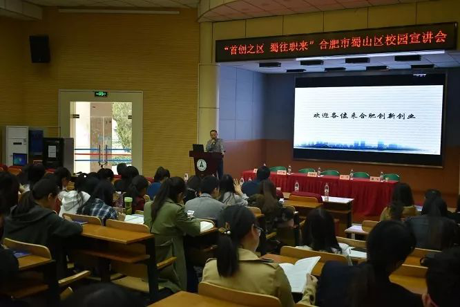 為進(jìn)一步引導(dǎo)各類人才來肥創(chuàng)新創(chuàng)業(yè),在兩所高校報(bào)告廳內(nèi),分別安排了一場政策宣講會。市人力資源和社會保障局人才開發(fā)處副處長葉學(xué)強(qiáng)從歷史文化、產(chǎn)業(yè)特色以及“十二五”期間發(fā)展等方面介紹了合肥,并重點(diǎn)解讀了合肥市最新出臺的人才新政;區(qū)人力資源和社會保障局黨委書記、局長谷和亮則聯(lián)系自身求學(xué)、走上工作崗位的經(jīng)歷和高校學(xué)子憶往昔、談初心,并從交通、經(jīng)濟(jì)、科教、生態(tài)、政策等多角度介紹合肥市蜀山區(qū)區(qū)情。最后,谷和亮向同學(xué)們發(fā)出了邀請:“合肥是廣大青年人創(chuàng)業(yè)創(chuàng)新的寶地,是培養(yǎng)人才、涵養(yǎng)的地方,希望對合肥感興趣的同學(xué)們到合肥來,到蜀山來就業(yè)創(chuàng)業(yè)”。